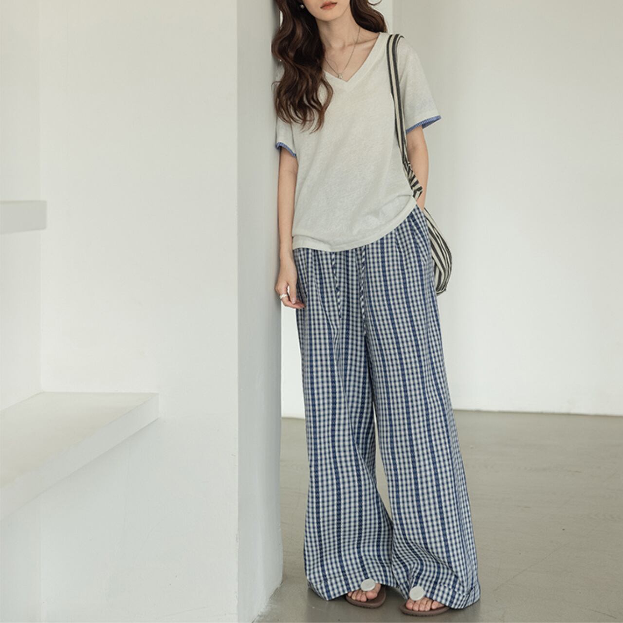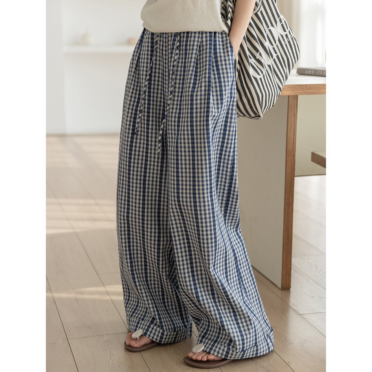 魅力的なギンガムチェック柄のワイドドレープパンツ。