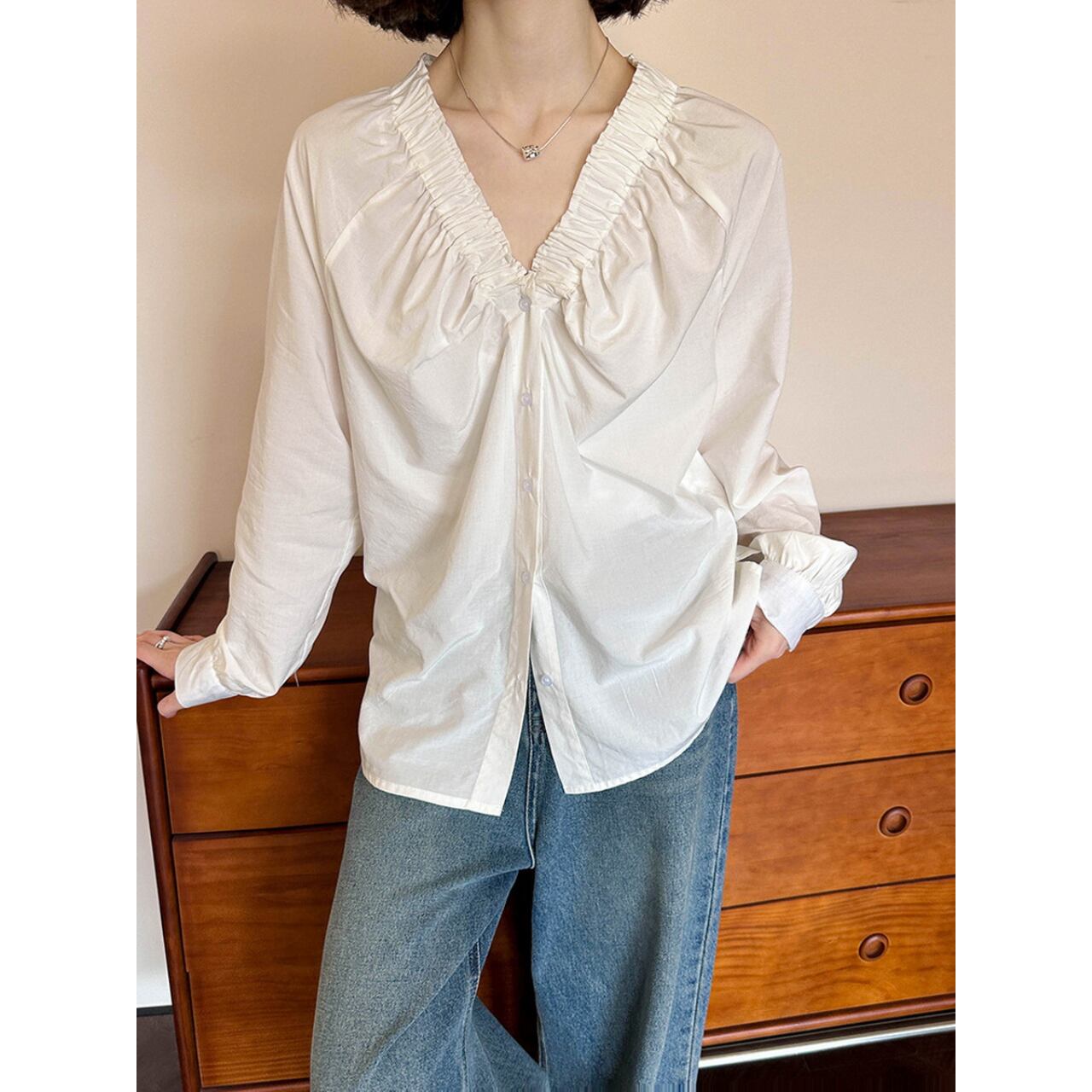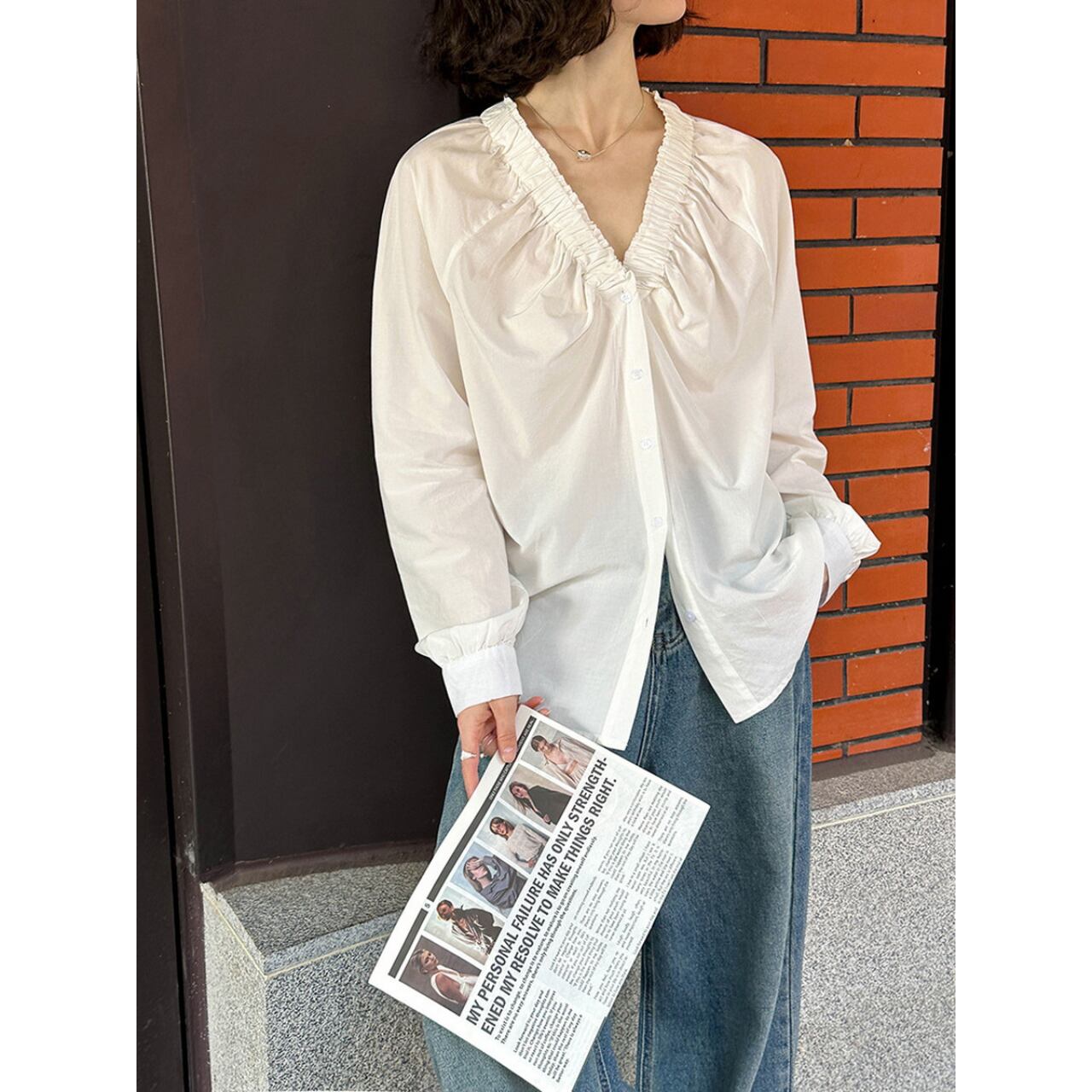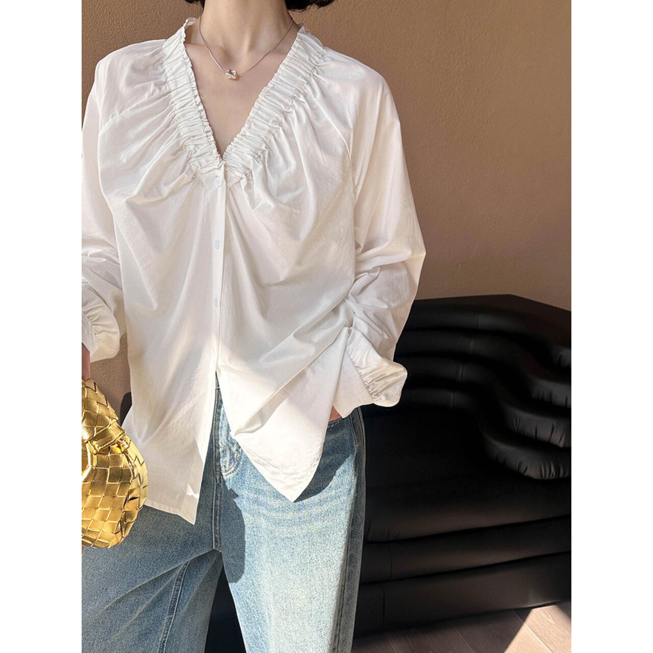 エレガントな印象を与えるギャザーネックラインのブラウス。