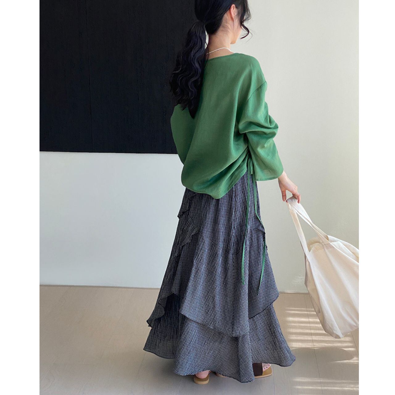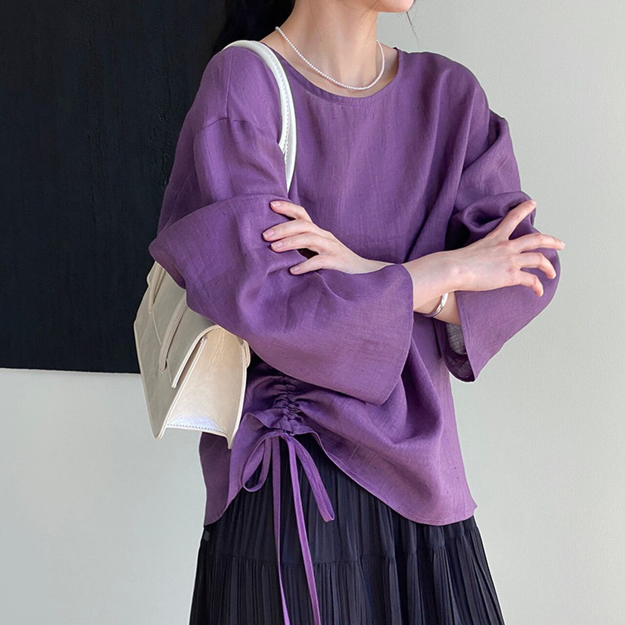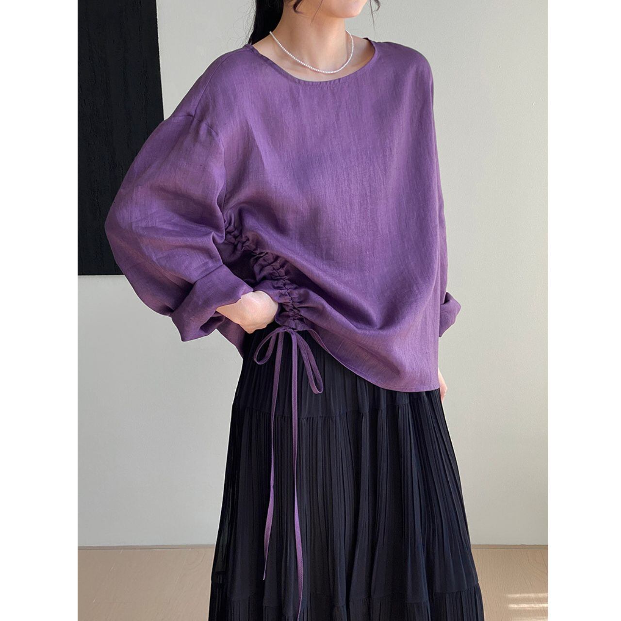 サイドドローストリングが特徴的なブラウス。